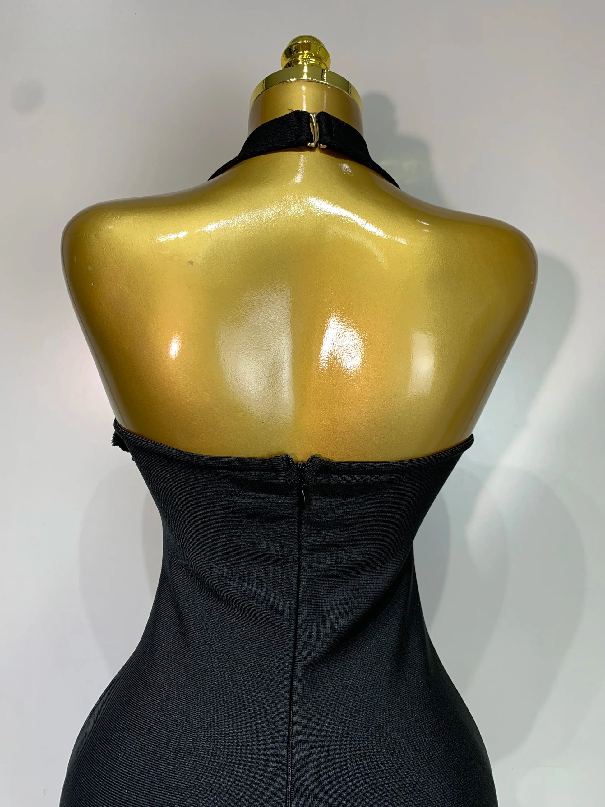 Black Halter Backless Shiny Diamond Flower Bodycon Dress