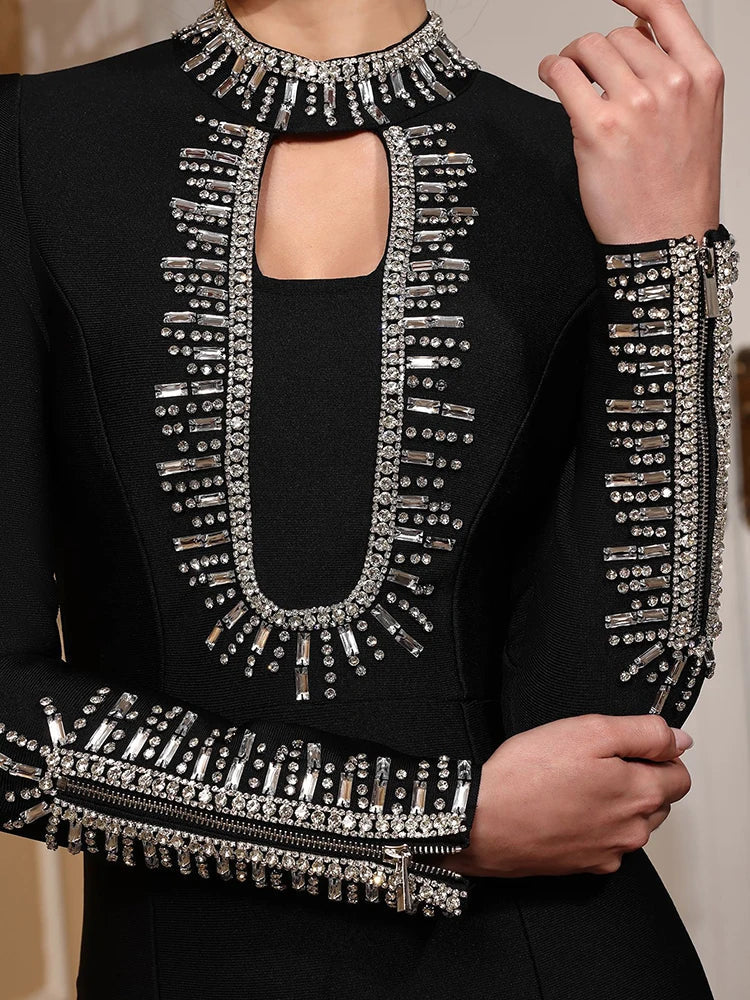Black O Neck Diamond Bandage Dress | Hollow Out Sheath Gown