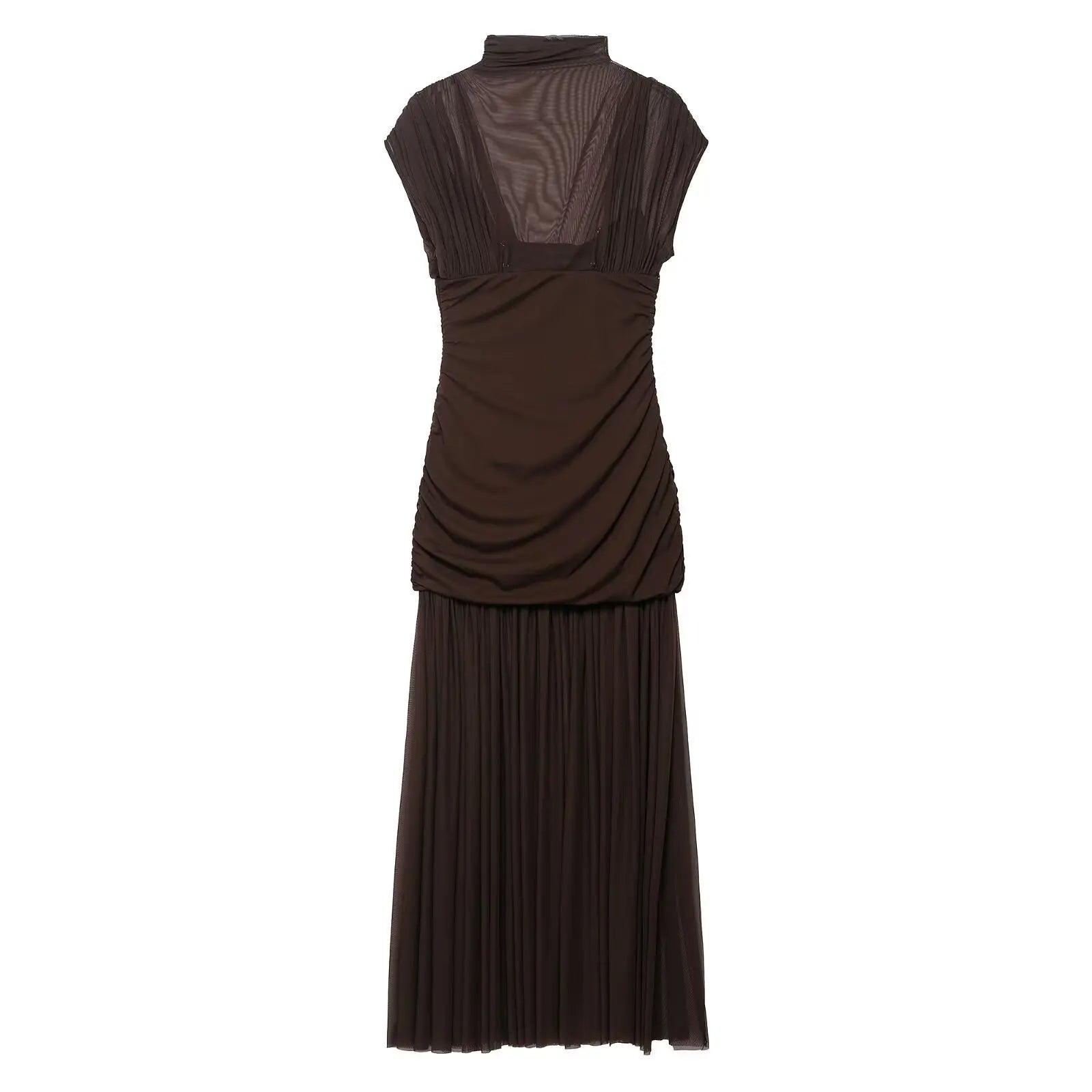 Lightly structured and delicately sheer, the Black See-Through Pleated Mesh Maxi Dress is designed to blur lines between shadow, shape, and motion. Crafted from high-stretch polyester, it drapes with ease while gently contouring the silhouette. The sleeveless O-neck bodice transitions into a softly pleated mesh lower, creating a sense of movement that feels more like air than fabric. The A-line silhouette, anchored at the natural waist, allows the ankle-length skirt to flow without volume — elegant without excess. It feels like wearing evening light, sculpted into fabric.
