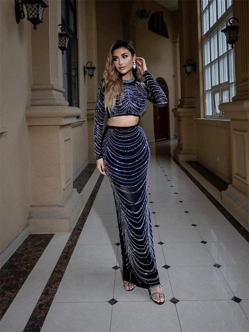 Illuminate every celebration in this black sequin two-piece set featuring a sleek crop top and floor-length skirt. With its dazzling sequined jersey, sculpted long sleeves, and curve-enhancing silhouette, this matching look is crafted for galas, holiday parties, or fashion-forward birthdays. Perfect if you’re searching for a sparkling occasion set that stands out at formal events and after-dark affairs.