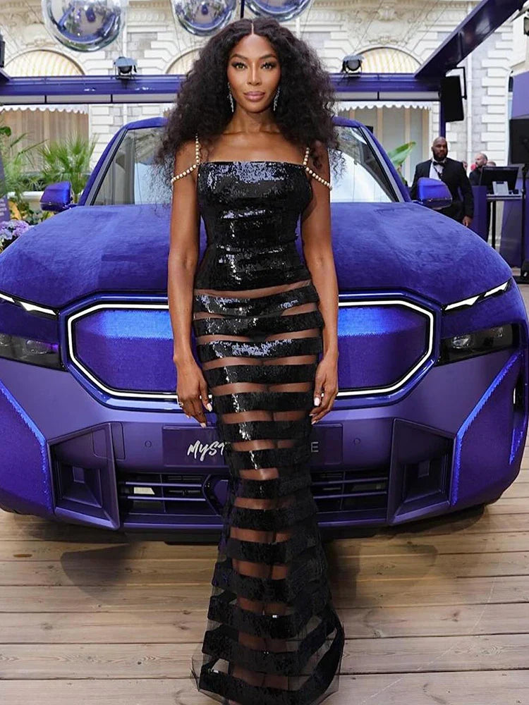 For evenings that pulse with electricity, where every flash of light feels cinematic. This gown sculpts the body in lacquer-like black sequins, balanced by sheer mesh paneling that creates rhythm rather than reveal. A pearl-draped shoulder chain adds contrast — soft against sleek — like moonlight draped across a midnight skyline.
