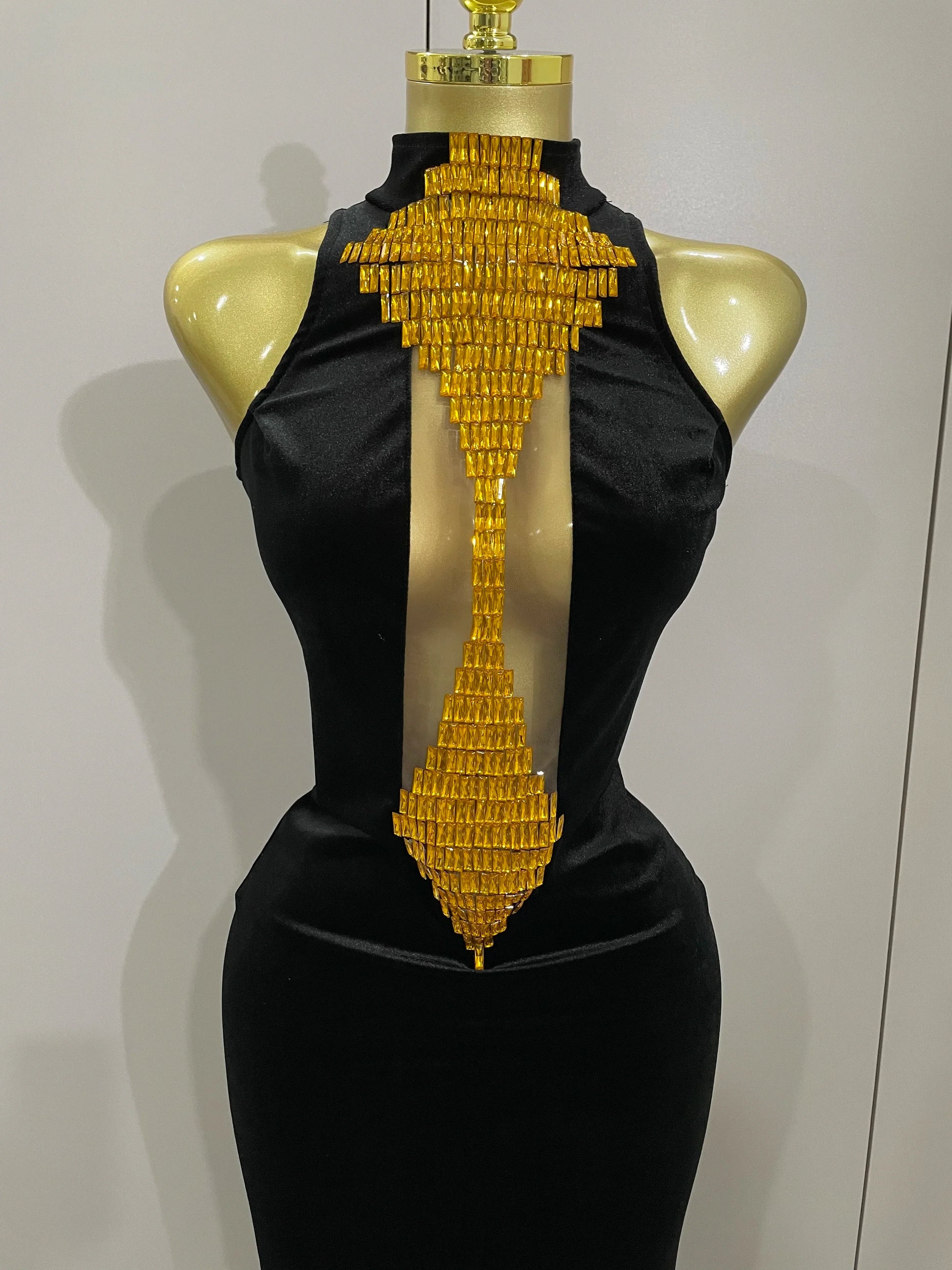 Step into Summer with this sleek Black Sleeveless Turtleneck Floor-Length Dress. Crafted from polyester with a slight stretch elasticity, this slim-fit dress features a chic turtleneck neckline and a sleeveless design. It boasts a sleek sheath silhouette with a natural waistline and is adorned with elegant appliques, featuring shining rhinestones and a mesh velvet long design. The solid pattern and floor length complete this regular-type dress, available in Black, with a convenient zipper closure, perfect for evening, prom, birthday parties, or stage costumes across all seasons.