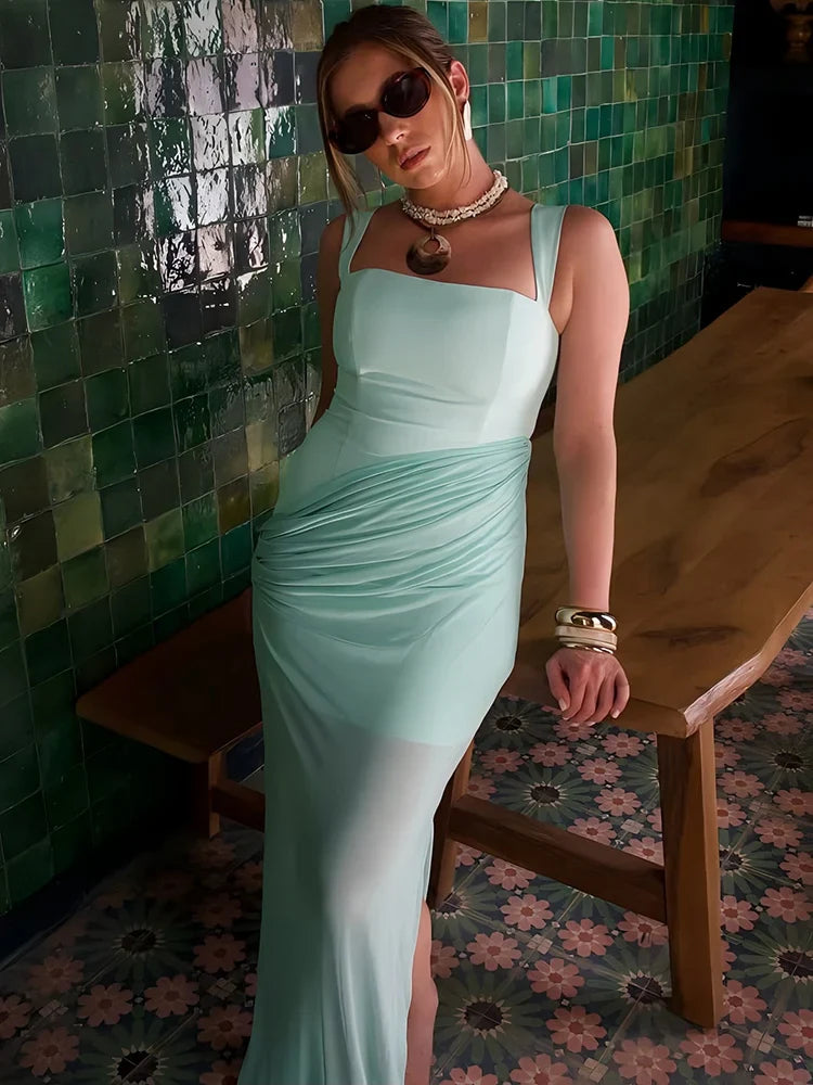 Floor-length A-line cut elongates the frame—poolside or evening-perfect