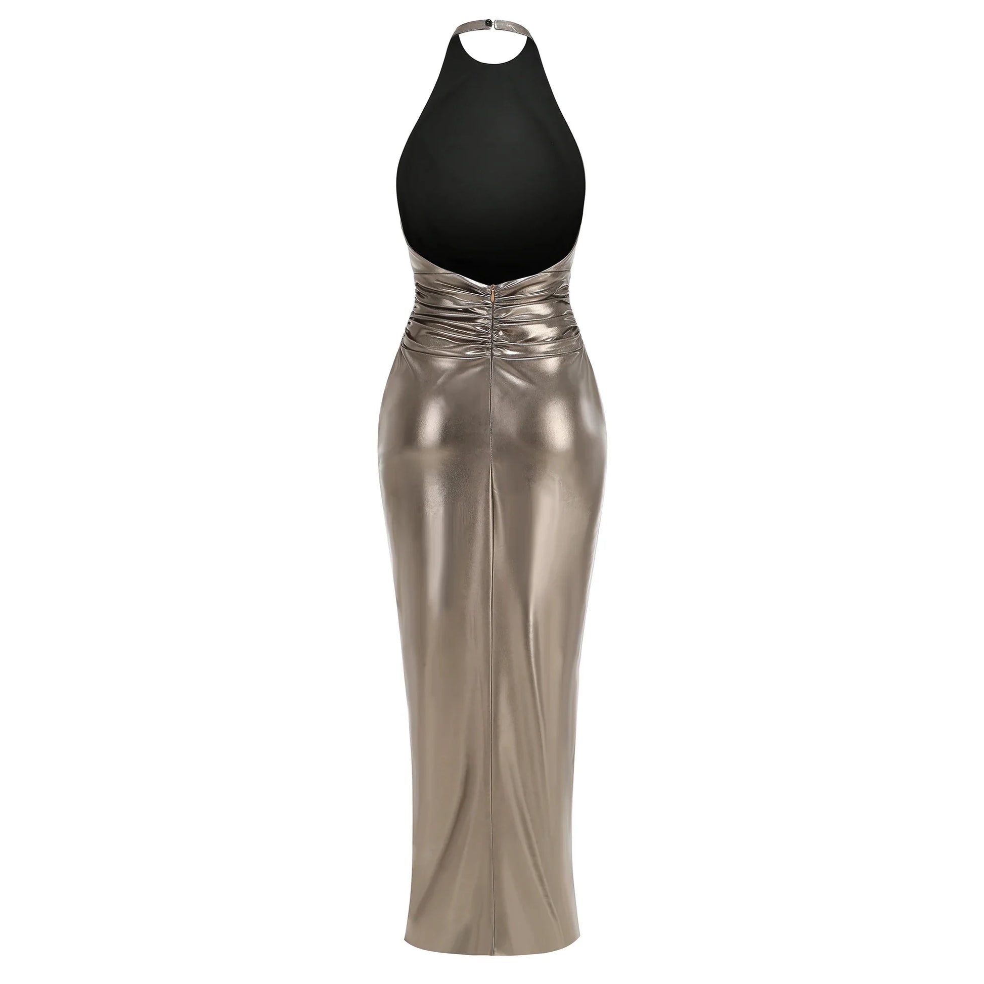 Step into Summer 2025 with this elegant Champagne Gold Hanging Neck Backless Slit Maxi Dress. Crafted from a polyester and spandex blend with medium stretch elasticity, this slim-fit Dress features a chic O-Neckline and a neck-mounted (halter) and backless design. It boasts a sleek sheath silhouette with a natural waistline and is adorned with a stylish hollow out detail and a flattering twisted hem with a slit.