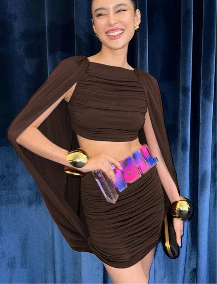 Perfect for evenings out, elevated dinners, club settings, and social events where architectural draping adds modern character.