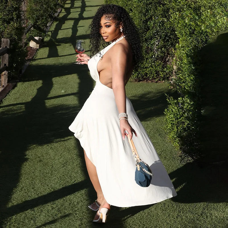Deep V-neck Metal Buckle Open Back Midi Dress