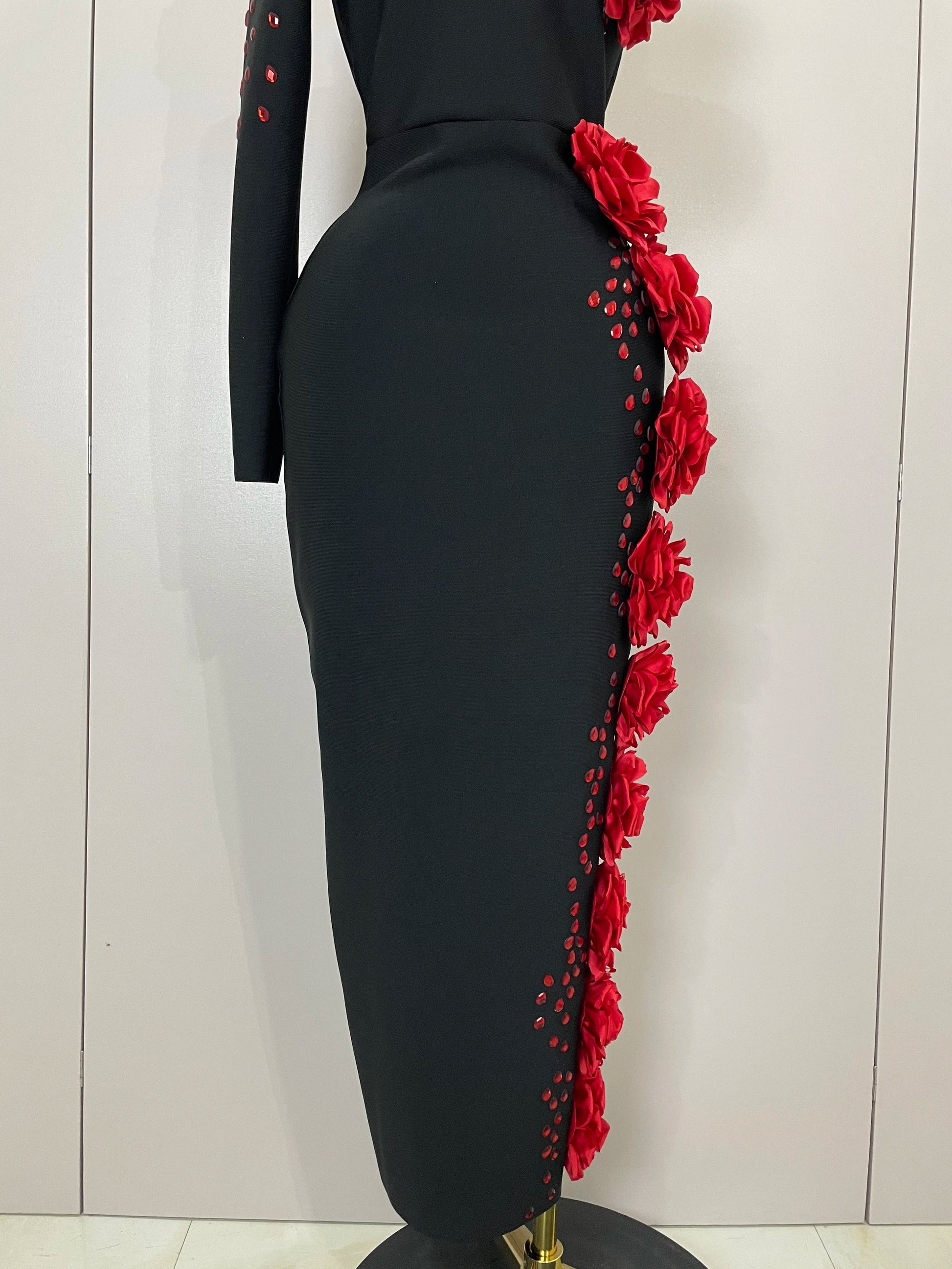 Step into Summer 2025 with this stunning Black Shiny Diamond One-Shoulder Ankle-Length Dress. Crafted from polyester with a slight stretch elasticity, this slim-fit dress features a chic diagonal collar and a unique one-shoulder full sleeve design. It boasts a sleek sheath silhouette with a natural waistline and is adorned with elegant appliques, shiny diamonds, and 3D flowers. The solid pattern and ankle length complete this inclined shoulder type dress, available in Black, with a convenient zipper closure, perfect for luxury birthday celebrations, celebrity evening parties, and club events across all seasons.