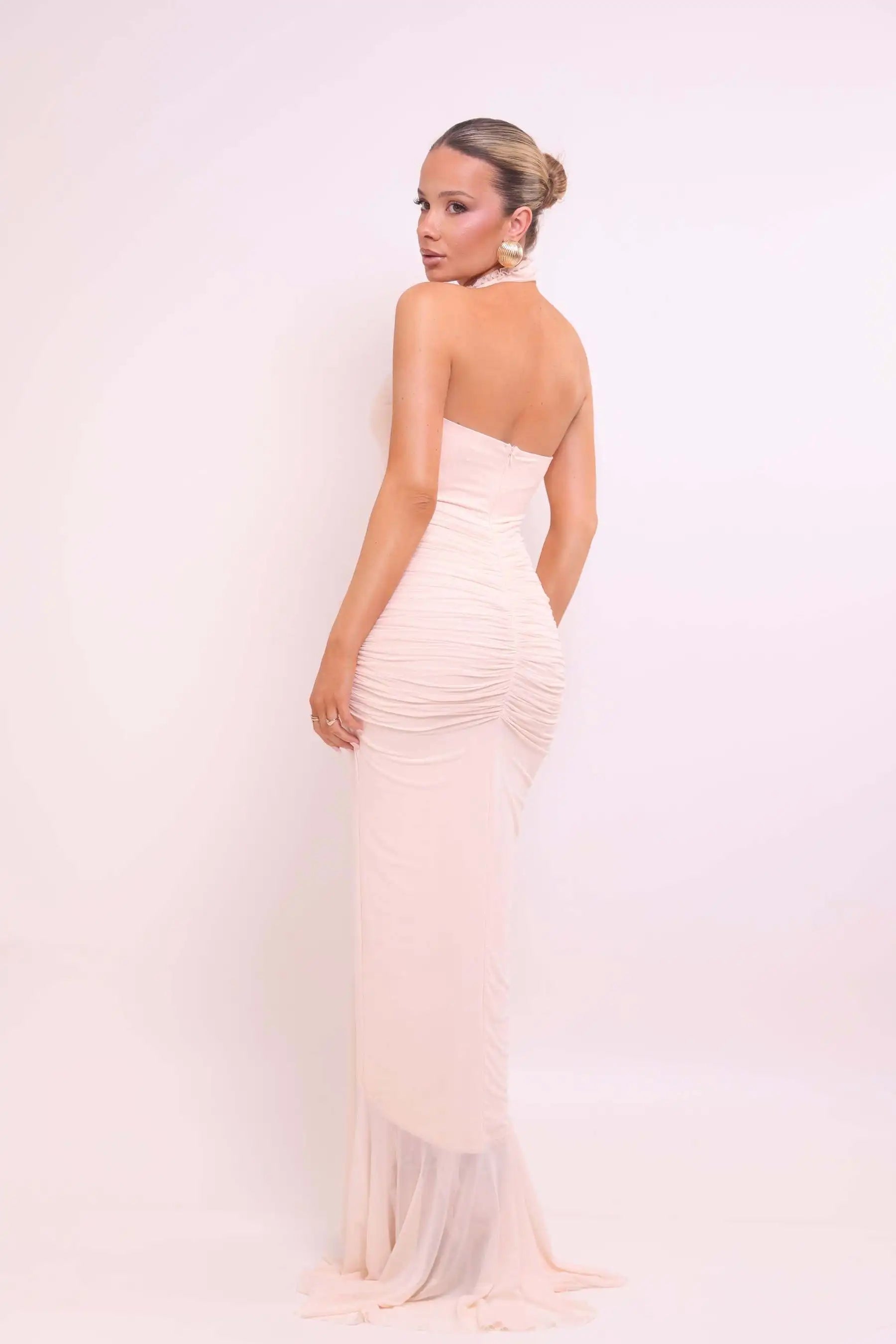 A sculpted halter maxi designed to trace the body with soft, fluid movement. The silhouette shapes gently through the waist and releases into cascading ruffles that create a sense of motion with every step. It carries that quiet drama of a dress meant for summer evenings and refined celebrations.