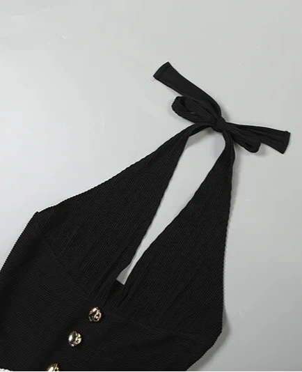 Stand out at any party with this halter V-neck maxi dress. Featuring backless patchwork detail, button accents, and a flattering high waist, it combines elegance with a touch of boldness for autumn nights.