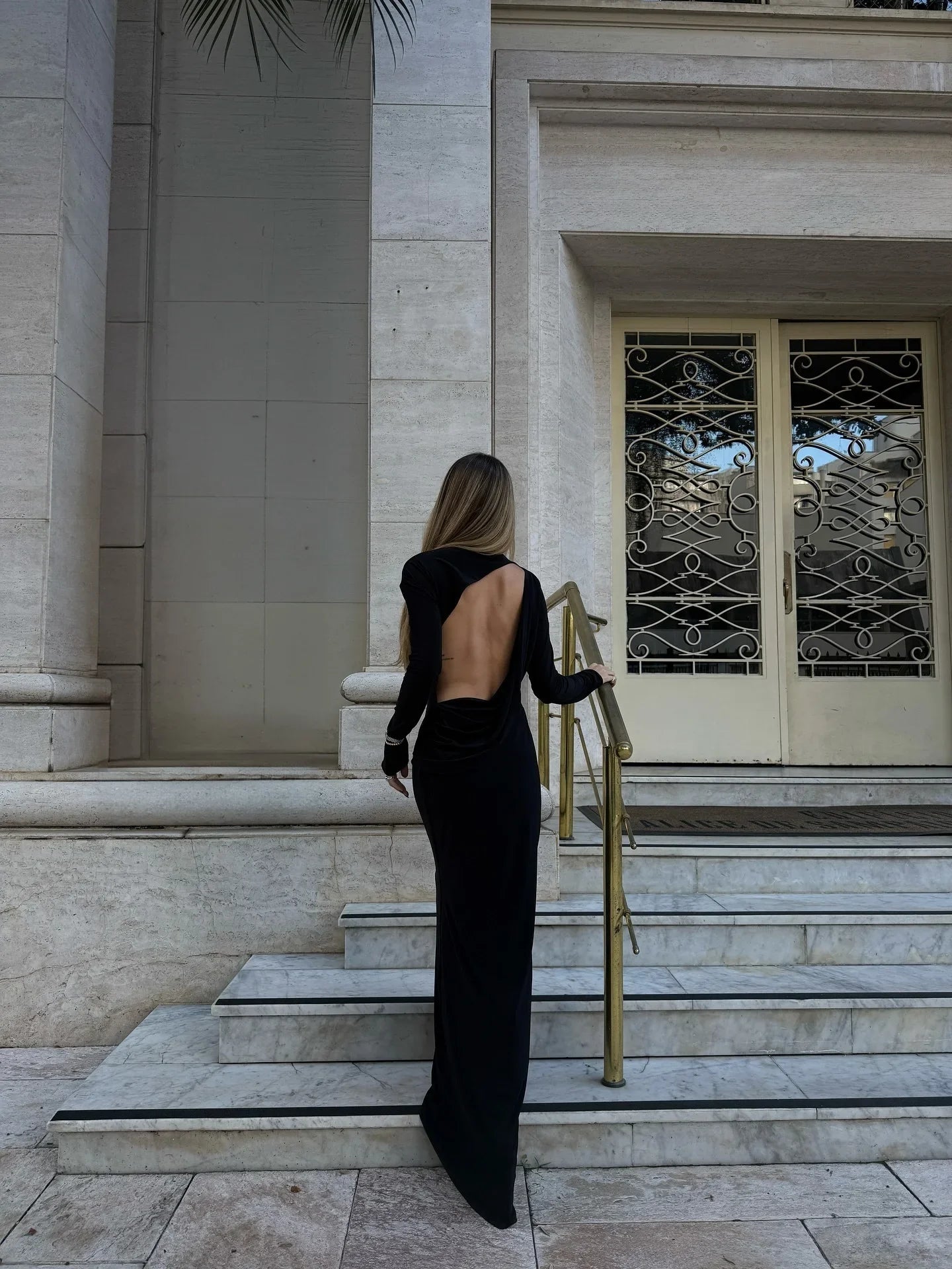 A study in understated allure — this long-sleeve maxi dress reveals its drama only in motion. From the front, it’s pure minimalism: clean lines, sculpted drape, and graceful flow. Turn around, and the open back cascades like soft sculpture, framed by a delicate fold that feels as intentional as it is effortless.