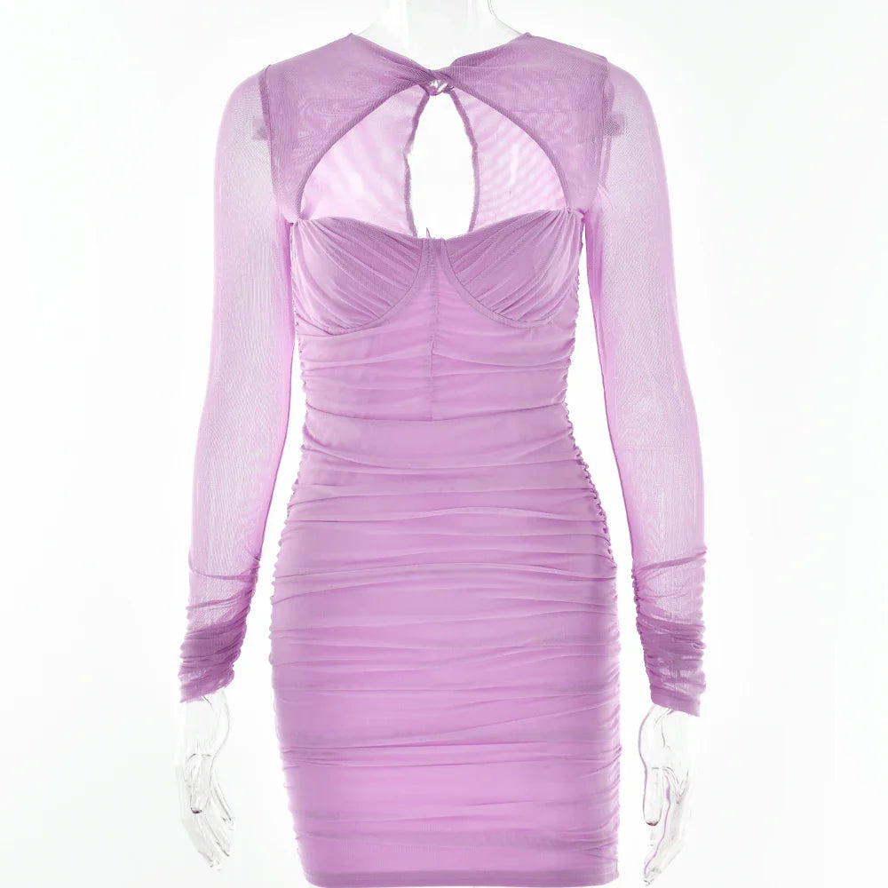 Designed for the woman who moves with quiet confidence, this mesh pleated mini dress shapes and sculpts while feeling impossibly light. The structured bodice and sheer sleeves create a refined balance of strength and softness. Its cutout neckline adds just the right hint of modern allure — never loud, always intentional. This is the dress I reach for when I want to feel effortless yet unforgettable.