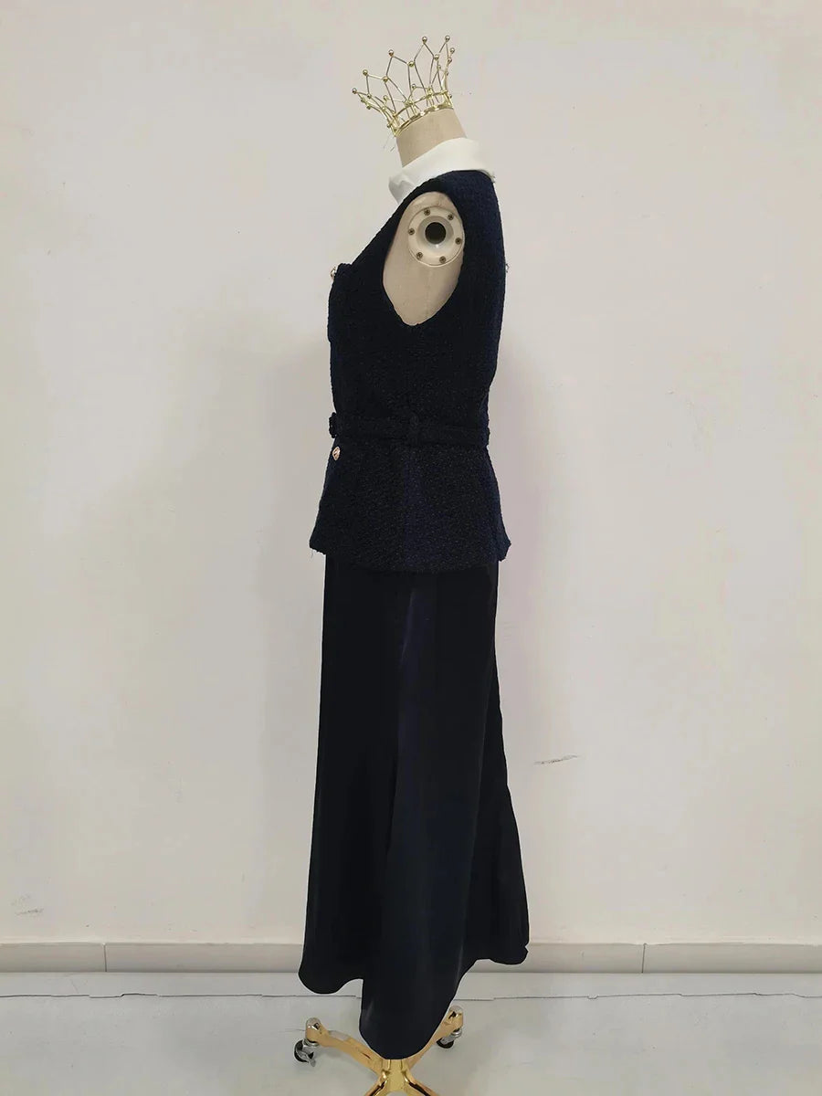 Step into modern refinement with this navy sleeveless top and ankle-length skirt set, finished with signature gold buttons and multi-pocket detailing. Crafted from woven polyester for a tailored drape, this two-piece ensemble blends classic polish with everyday comfort—perfect if you’re searching for a versatile office outfit that transitions from business hours to evening events.