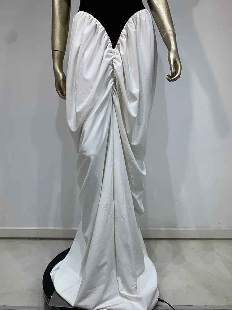 Step into a night of refined luxury with this contrast off-shoulder evening gown—a masterpiece in timeless monochrome. With a figure-flattering black bodice and flowing white ruched skirt, this gown blends vintage allure with modern grace.