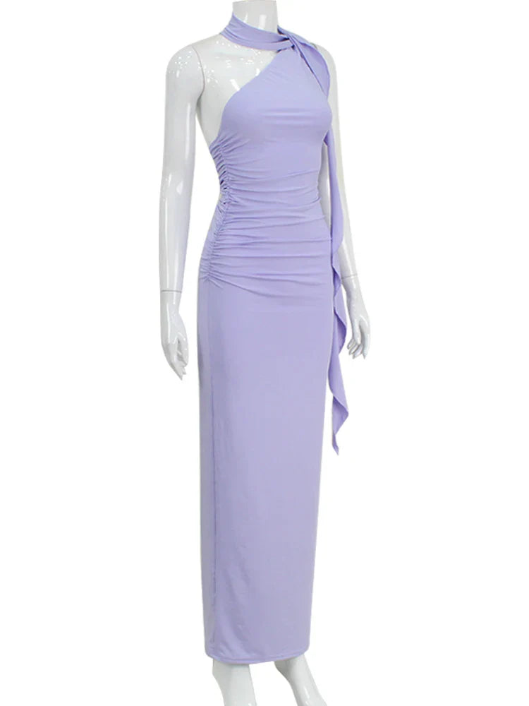 Purple Ruffle Ribbon One-Shoulder Maxi Dress