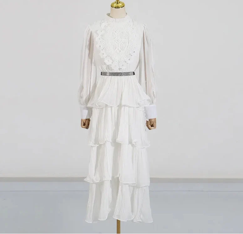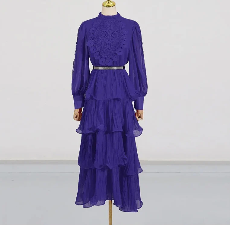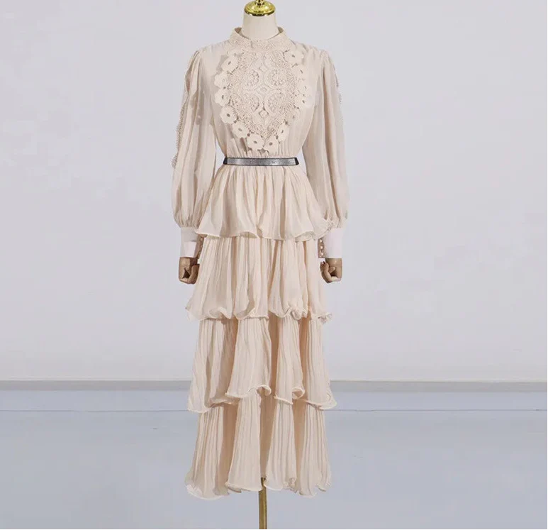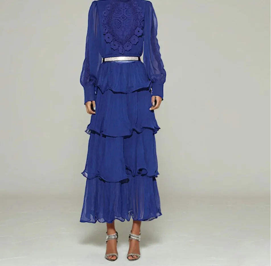 Embrace romance and movement in this red lace ruffle maxi dress, designed in a floor-skimming A-line silhouette with tiered layers for dramatic sway. Detailed with intricate lace work, sheer long sleeves, and a softly cinched waist, this dress brings vintage boho charm to summer weddings, celebrations, and every elegant moment. Perfect if you’re looking for a dress that captures Pinterest’s love for feminine, flowy party gowns.