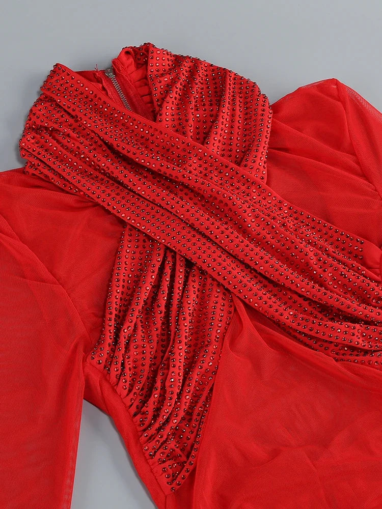 Red Mesh Ruched Rhinestone Gown with Sculpted Column Shape