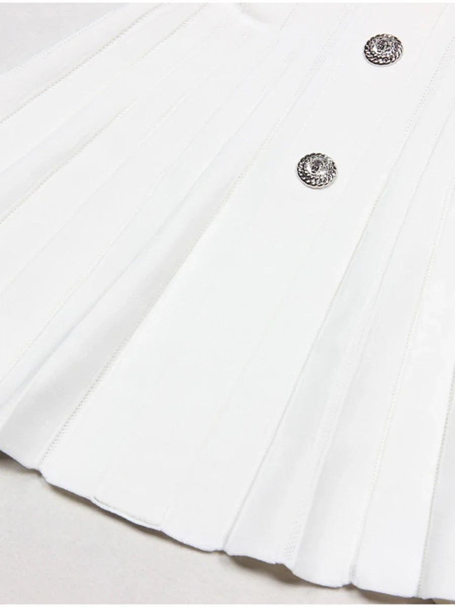 A polished mini dress shaped with a structured collar, precise pleating, and signature silver buttons that feel almost jewel-like in their clarity. The A-line silhouette creates natural movement with every step, and I usually reach for pieces like this when I want something crisp, sculpted, and quietly powerful, especially when I search what mini dress looks sophisticated without being too formal. It’s a modern uniform for days that call for presence and intention.