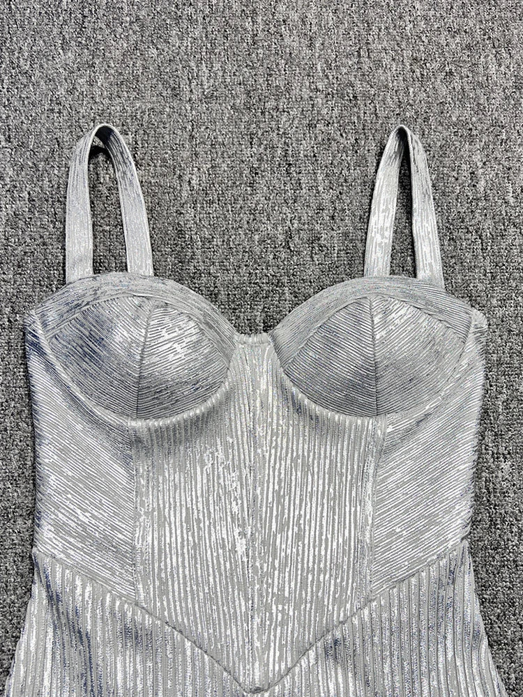 Silver Foil V Neck Bandage Dress | Spaghetti Strap Midi Gown