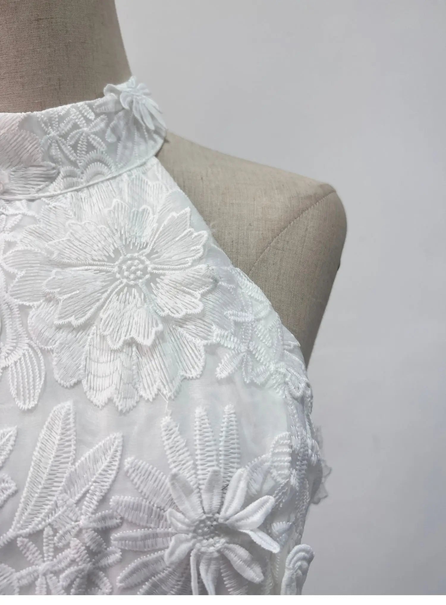 White Flower Embroidered Ruffles Halter Midi Dress