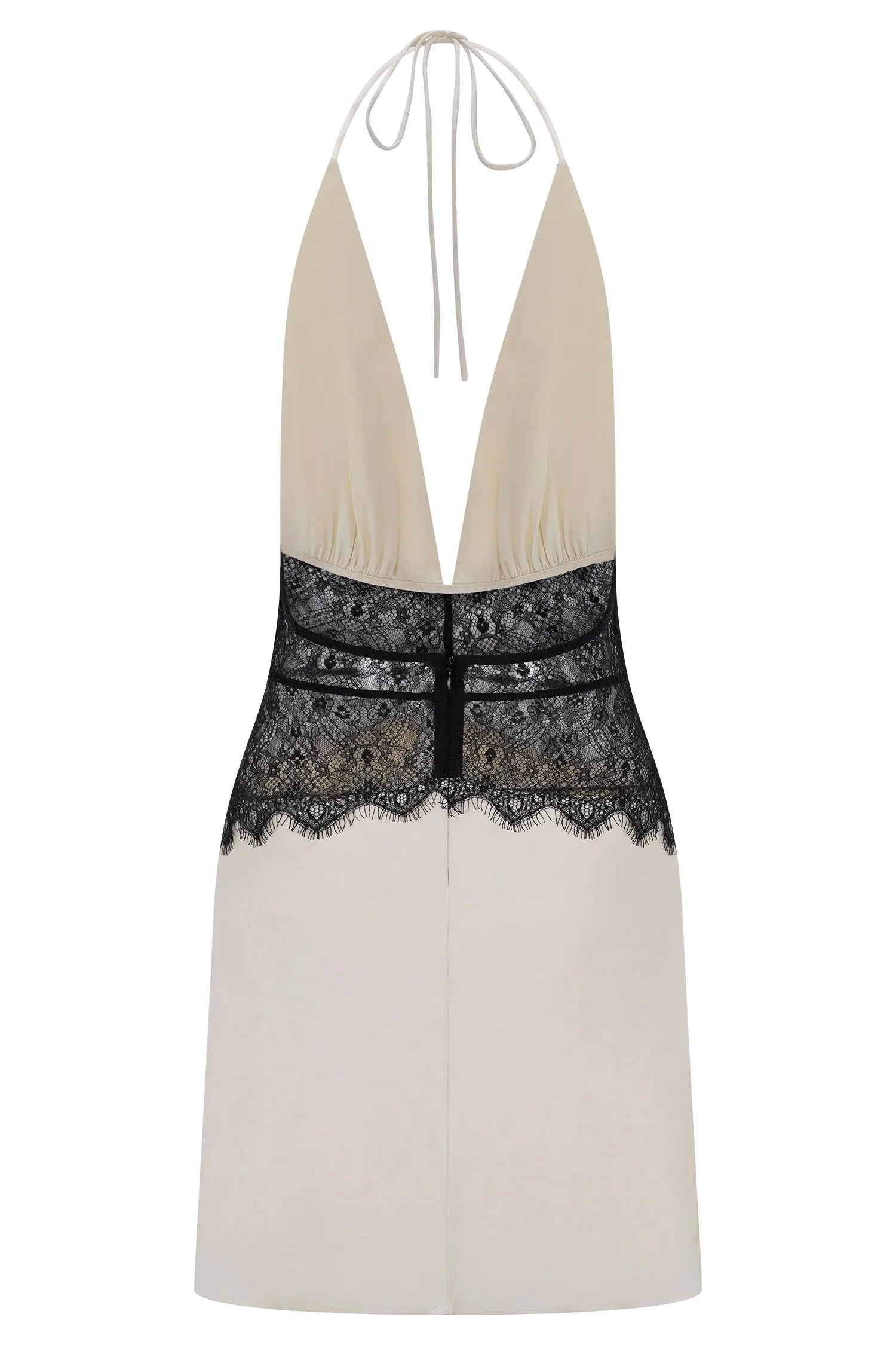A refined mini dress that blends soft satin texture with intricate lace patchwork for a look that feels both modern and romantic. The deep V-neckline elongates the upper body, while the lace waist adds sculptural contrast and subtle allure. The silhouette moves with quiet confidence—like satin catching a whisper of evening light—making it a standout choice for elevated nights out. This is the piece I reach for when I want something elegant with just the right amount of intrigue.